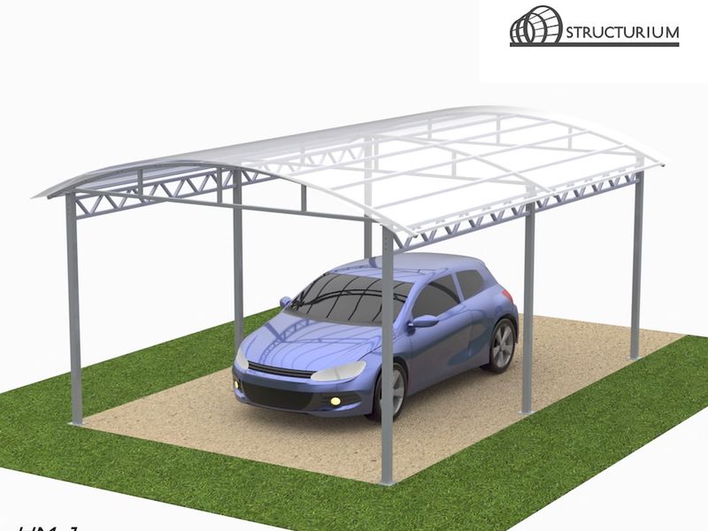 При производстве Навеса для машин используется профильная труба 80*80*3мм, 40*40*2мм и 40*20*2мм. Покрытие крыши – прозрачный сотовый поликарбонат 10мм. Покраска полимерная порошковая с предварительным нанесением цинкосодержащего грунта, цвет серый.
