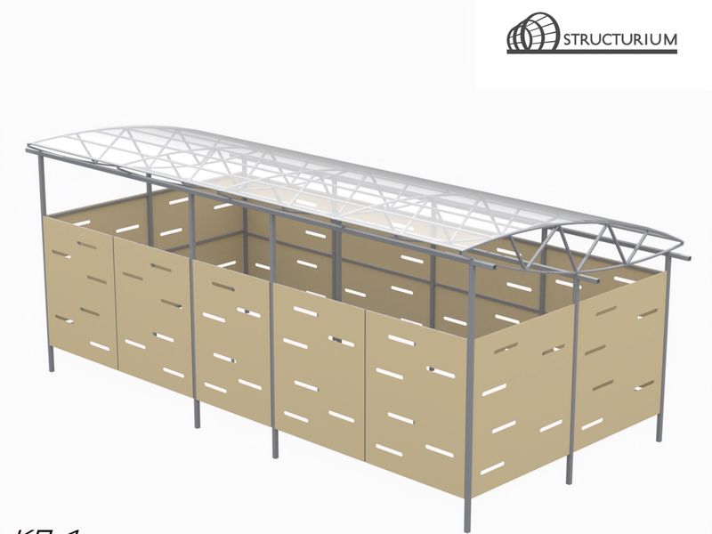 При производстве Контейнерной площадки используется профильная труба 60*60*3мм и 40*25*2мм. Покрытие крыши – прозрачный сотовый поликарбонат 10мм. Обшивка по периметру – алюминиевые композитные панели. Покраска полимерная порошковая с предварительным нанесением цинкосодержащего грунта, цвет серый.