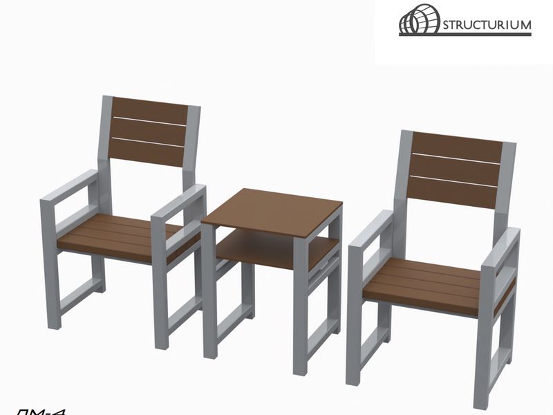 При производстве Стульев со столиком используется профильная труба 60*40*2мм, 60*30*2мм и 30*30*2мм. Материал сидения стульев – доска 100*40мм. Материал спинки стульев – доска 100*30мм. Материал столешницы и полки столика – влагостойкая ламинированная фанера 9мм. Все дерево обработано атмосферостойким покрытием. Покраска полимерная порошковая с предварительным нанесением цинкосодержащего грунта, цвет серый.